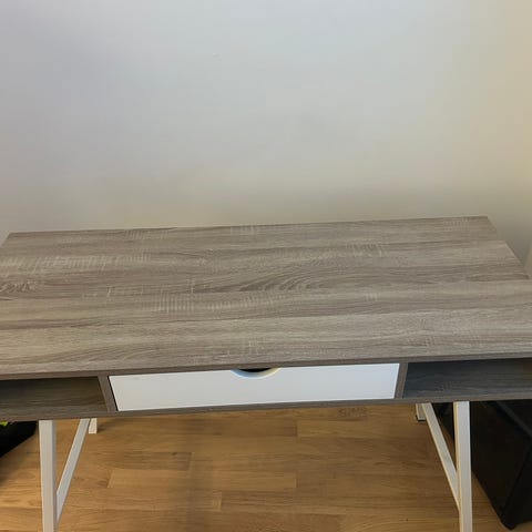 Ensimmäiselle noutajalle 5 eurolla tukeva ja toimiva 1960-luvun sininen työpöytä. Reunassa kulumaa.