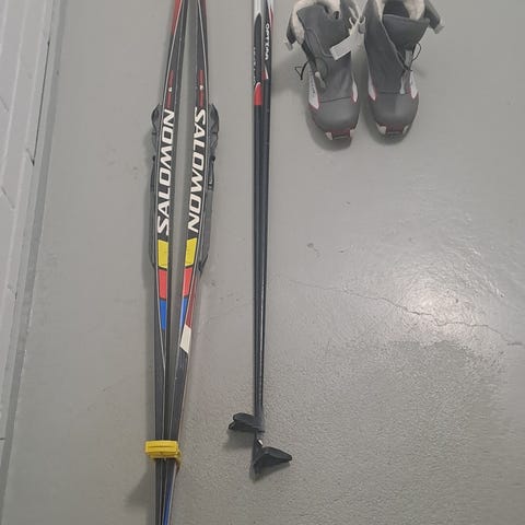 Hyväkuntoinen suksisetti, jäänyt vähälle käytölle. Sisältää sukset sauvat ja monot, koko 44. Merkki Peltonen.