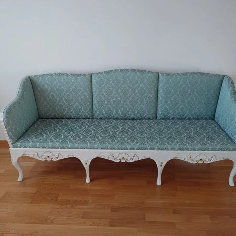 Antiikkinen kolmen istuttava samettisohva, jossa on tummanruskea samettiverhoilu ja koristeellinen puukehys. Sohvassa on kaareva selkänoja ja yksityiskohtaiset puukaiverrukset. Sohvan jalat ovat veistettyä puuta. Sopii olohuoneeseen tai tilaan, jossa arvostetaan klassista sisustustyyliä. Vain nouto.