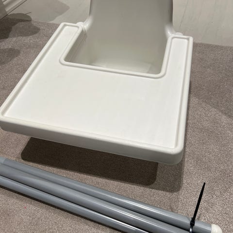 Myydään ikean antilop syöttötuoli tarjottimella.