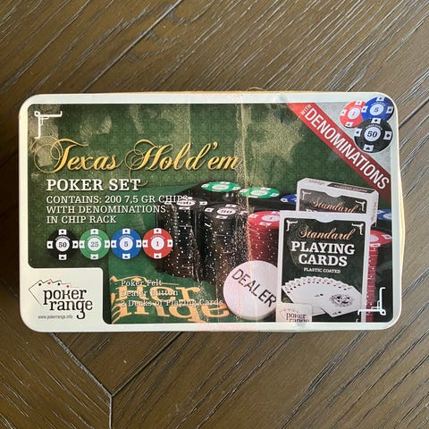 Poker Texas Hold'em setti ja pelimerkit eri väreissä. Mukaan myös kuvan korttipakan sekoittaja.