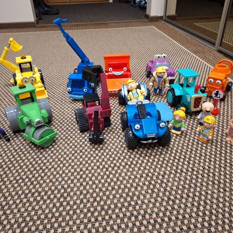 Puuha Pete hahmot ja ajoneuvot. Pete, Putte, Hyrre, Rolle, Kippi, Tatu ja Kaivuri.