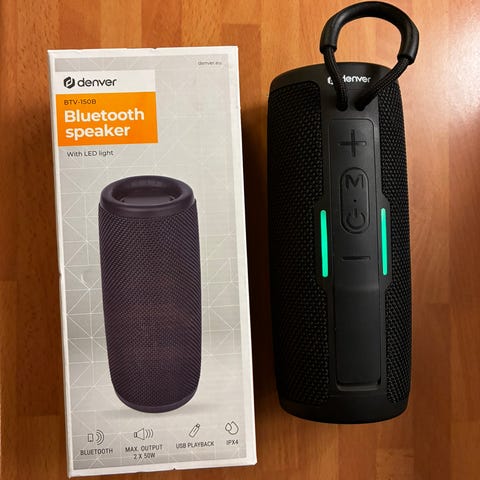 Denver BTG-615 Bluetooth-kaiutin, jossa LED-valotehosteet. Mukana USB-latauskaapeli, käyttöohje ja alkuperäispakkaus. Lisäksi mukana AUX-piuha jota ei kuvassa. Kaiutin toimii moitteettomasti, kuvassa näkyvä särö ei vaikuta äänenlaatuun tmv. Nouto Tampereen Linnainmaalta, kulkeutuu tarvittaessa myös Forssaan.