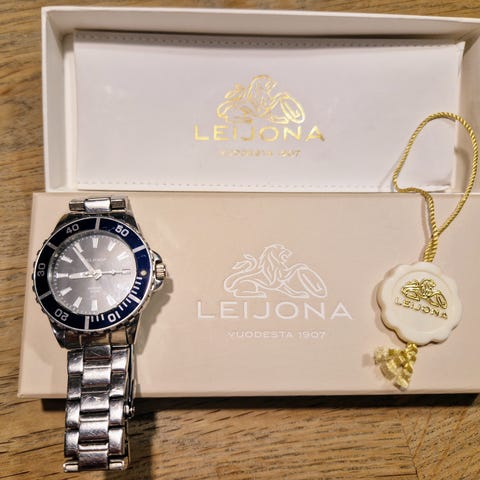Myydään Leijona miesten kello. Kellon lasi on safiiria.kelossa on suomenkielinen päivyri ja vesitiiviis 10atm.Myyn kellon alehintaan koska kelloon pitää vaihtaa patteri joten rannehihna on jo irroitettu
