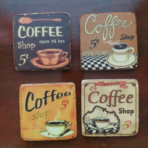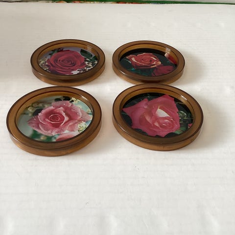 Taidenäyttelystä ostetut lasinaluset 4 kpl. Kunto moitteeton. Materiaali kumia.