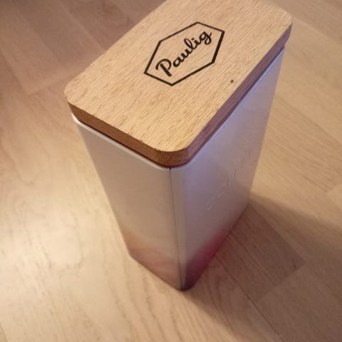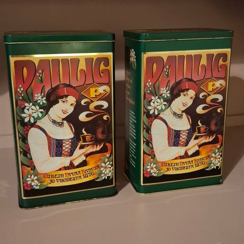 Paulig kahvipurkki, valmistettu metallista, ruskea väri.