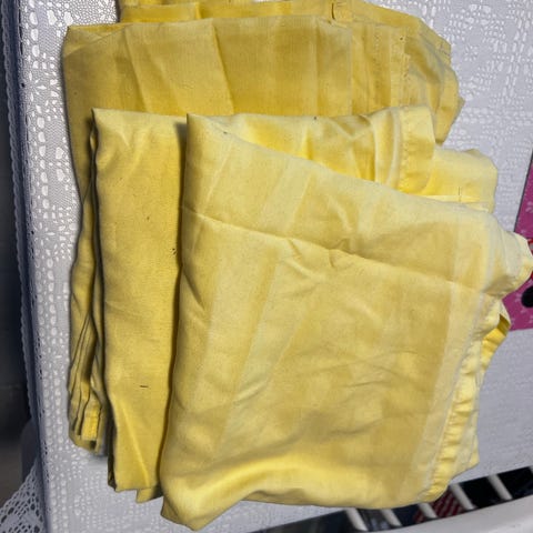 Kangasta. Eri kokoisia tilkkuja ja ehkä isompaakin palaa. Nämä olleet alunperin verhot, josta sitten leikattu eri tarkoituksiin.