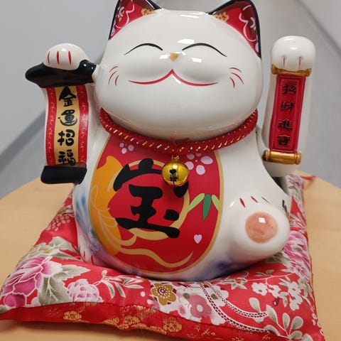 Kuvan mukainen uusi ja upea aurinkokennolla toimiva mekaaninen "sushiravintola"-onnenkissa ("Maneki Neko"). Kissa heiluttaa käpäläänsä, kun ympäröivä valaistus on riittävä!