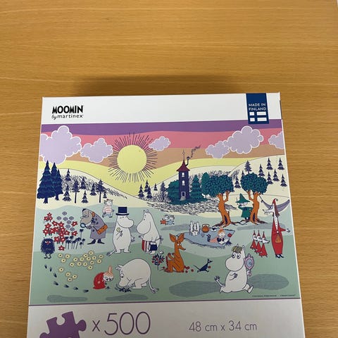 Muumit 500 palan palapeli, jonka koko on 48 x 34 cm. Palapelin kuva-aiheena on Muumilaakson hahmot ja maisemat.