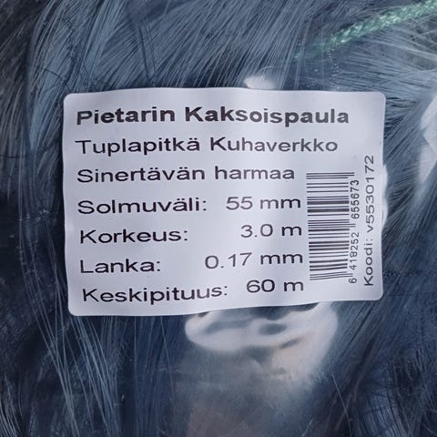 Väinö Kalaverkko kalaverkko, jonka silmäkoko on 50 mm, korkeus 5,0 m ja pituus 60 m. Verkko on valmistettu 0,17 mm paksusta materiaalista ja väriltään harmaa.