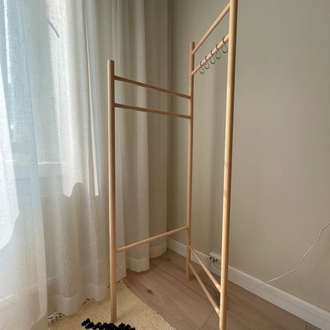 Myydään hyväkuntoinen ja jämäkkä Normann Copenhagen Toj-vaaterekki. Puuosat saarnia, alahylly ja tanko valkoiseksi maalattua terästä. Alatasolle saa kätevästi kengät ja laukut. Vaaterekin ovh uutena 470€.