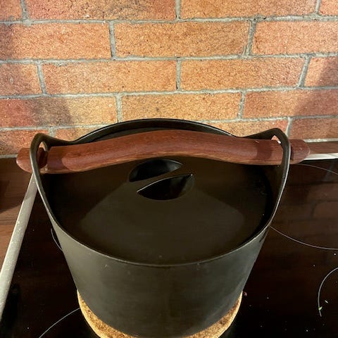 Iittala valurautapata, jossa on puinen kahva. Pata on musta ja sisäpuolelta valkoinen. Soveltuu ruoanlaittoon ja uunikäyttöön. Sisäpuolella jonkin verran tummentumia