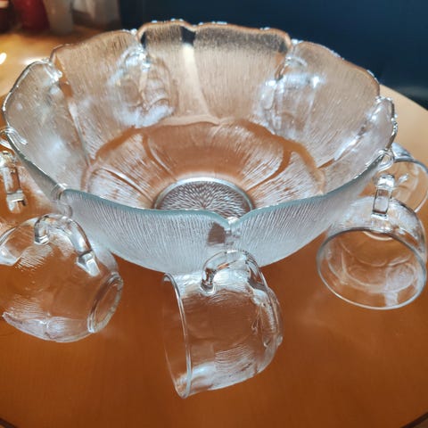 Lasinen boolikulho ja 8 lasia. Hyvässä kunnossa. Mukana 5 kpl pidäkkeitä, jolla lasit saa roikkumaan boolikulhoon.