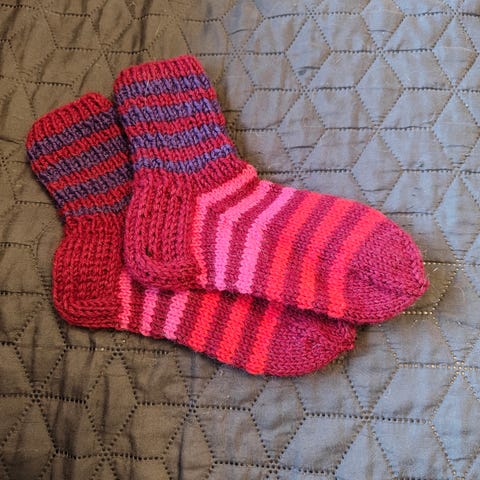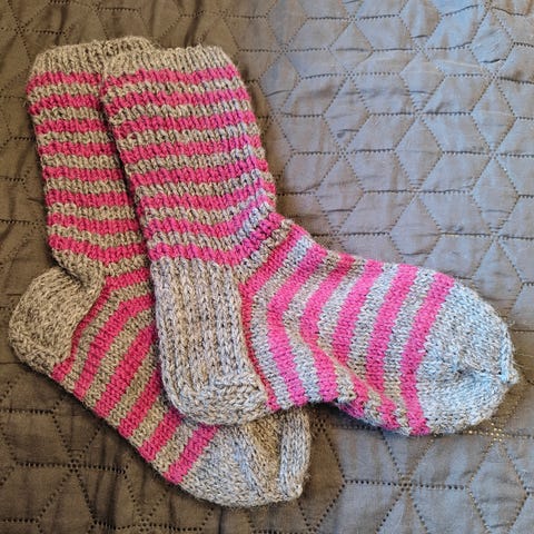 7 veljestä langasta tehdyt villasukat. Koko 36-37, pohjan pituus 22-23cm. Vain nouto hönttämäeltä.