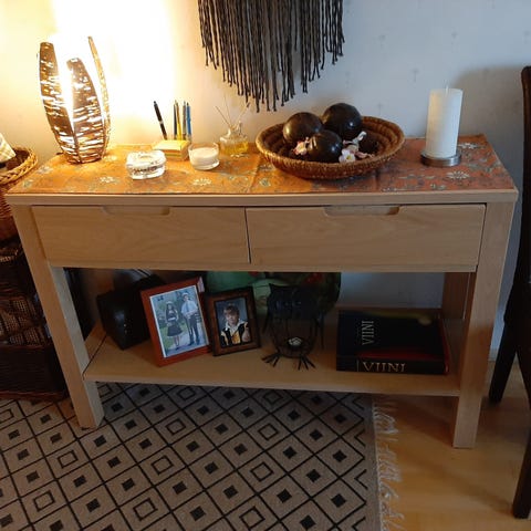Täyttä tammea oleva antiikki lipasto marmori kannella. Ylä osa on historian matkalla kadonnut. Tapin reijät näkyy 3 kuvassa