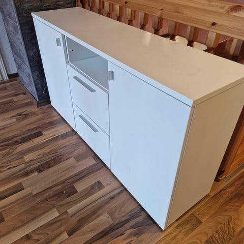 Siisti valkoinen senkki myynnissä. Mustan levyn tilalle löytyy myös valkoinen, jos haluaa mukaansa. Keskimmäisten vetolaatikoiden ovet huonosti kiinni, mutta helposti liimalla korjattavissa. Muutoin hyvässä, siistissä kunnossa.