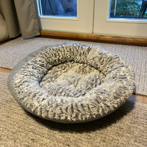 Vain pari kertaa käytetty harmaata samettia oleva koiranpeti. Mitat noin 50 x 57 cm.