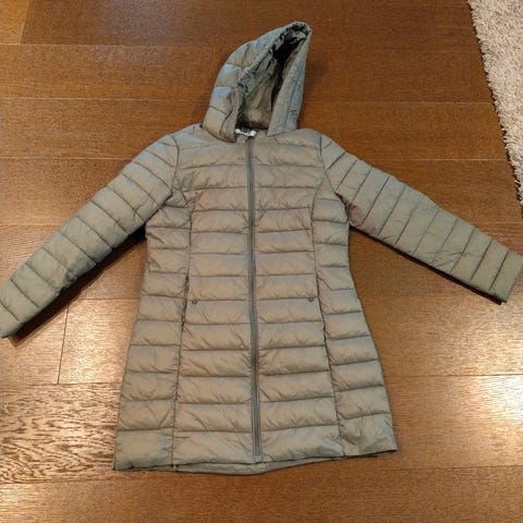 Tumman sininen kevytvanutakki. Pitkä. Kakkoslaatuinen eli vetoketjun kanssa saa olla huolellinen että saa takin kiinni mutta toimii siis. Huppu ja taskut löytyy.