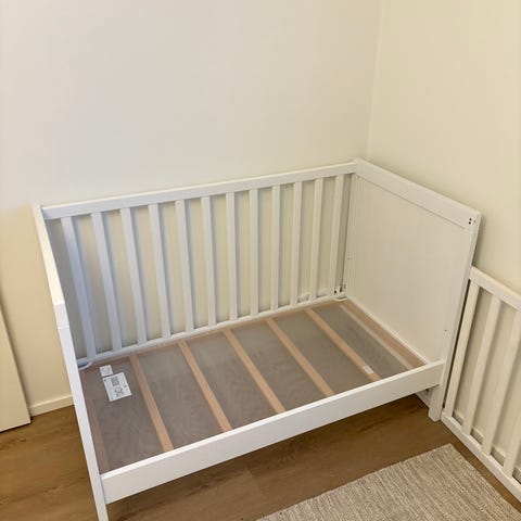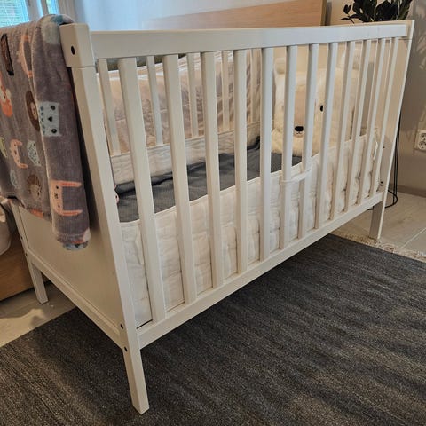 Tukeva ja hyväkuntoinen pinnasänky irrotettavalla laidalla. Pinnasängyn pohjan saa nostettua kun on ihan pieni vauva, ja laidan saa irrotettua taaperovaiheen koittaessa.