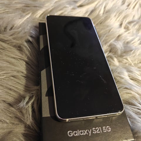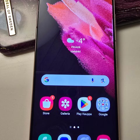 Samsung Galaxy S21 Ultra älypuhelin, jossa 128 gigatavua tallennustilaa. Puhelimen väri on lila. Mukana useita suojakuoria erilaisilla kuoseilla.