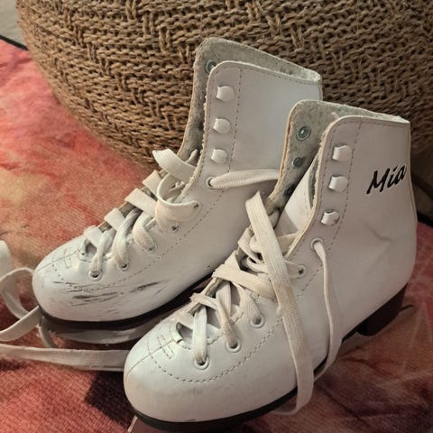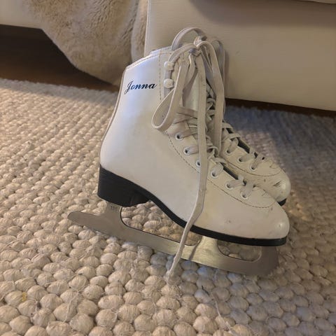Jonna lasten kaunokit, koko 32, valkoinen väri. Luistimissa valkoiset nauhat. Yksi nauhoista katkennut.