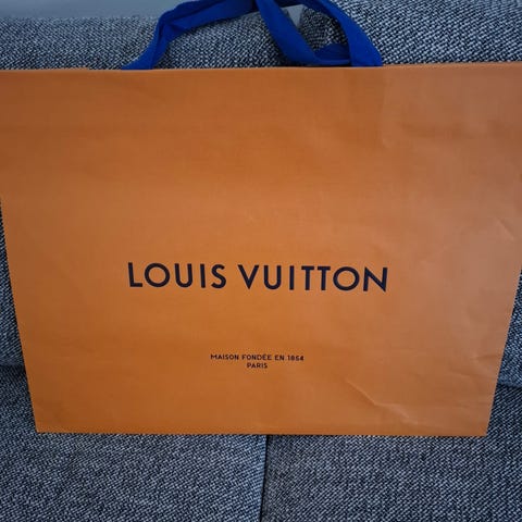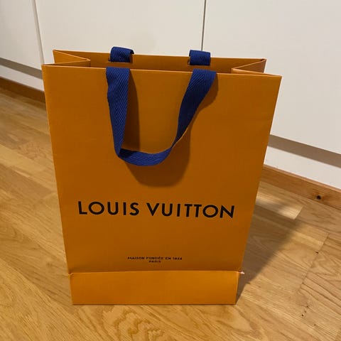Louis Vuitton paksu paperikassi sinisillä kangaskahvoilla. Koko 34x40cm, syvyys 16cm.