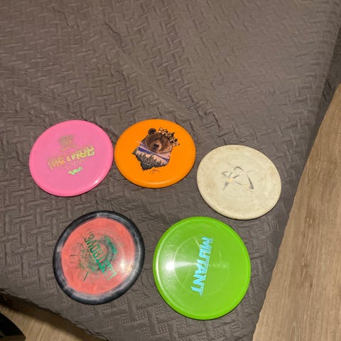 Prodigy Discgolf-laukku mustana, mukana useita eri malleja olevia discgolf-kiekkoja. Kiekot sisältävät eri merkkejä ja malleja,