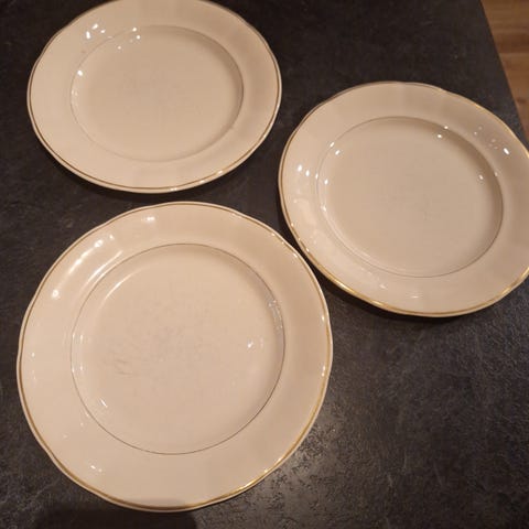 Vanhat, arabian ruusukranssi kuvioiset syvätlautaset. Kullattu reuna osin kulunut. Yhdessä lautasessa pieni halkeama ja yhdestä lohjennut pieni palanen reunasta.