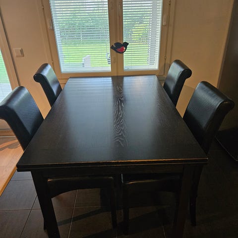Myydään jatkettava ruokapöytä ja 8 tuolia. Pöydän mitat: leveys 96 cm ja pituus lyhyenä 141 cm ja jatkettuna 191 cm. Pöydän materiaalista ei ole tietoa, jotain puuta tai puuviilua. Pöydän pinnassa on kulumaa ja naarmuja, tuolien selkänojien yläosat ovat myös kuluneet, mutta nämä saa kyllä kunnostettua. Tuolien päälliset on jo kertaalleen uusittu ja ne ovat ehjät. Nämä on helppo vaihtaa uusiin, jos väri tai kuosi ei miellytä. Sekä pöytä että tuolit ovat rakenteeltaan tukevat ja ehjät. Kaikki yhteishintaan 50 euroa.