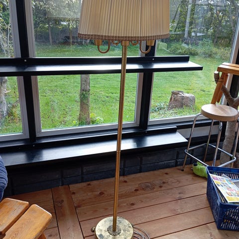 Setissä Jalkalamppu ja pöytälamppu. Molemmissa pitkät johdot näyttävät olevan hyvässä kunnossa (ei alkuperäiset). Lattialampussa on jalkapoljin. E27 kanta molemmissa, mutta lamput eivät tule mukaan.
