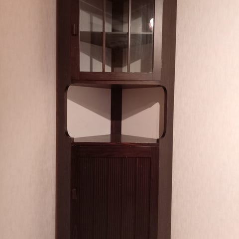 Myydään puinen kulmakaappi. Korkeus 88cm, leveys 110cm ja syvyys 66cm. Ovessa lukko. Lattiamalli (puiset jalat). Ei varauksia