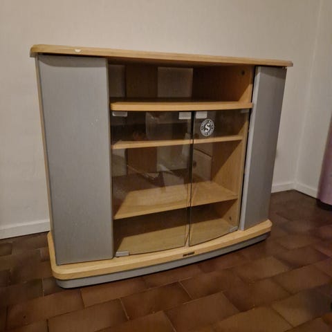 Annetaan valkoinen TV taso. Kumpikin lasinen liukuovi lähteneet paikaltaan, vaatii korjausta jos haluaa ne vielä käyttöön. Ne myös mahdollista irroittaa ja käyttää tasoa ilman niitä. Kummassakin kaapissa lasinen hyllytaso, joista saattaa jokin kiinniketappi olla hukassa. Siisti kunto muutoin. Vain nouto Ristikivestä.