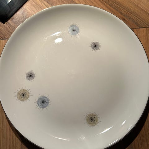 Suuri Arabian vanha ovaali tarjoiluvati. Piippuleima pohjassa. Pituus 32cm, leveys 23cm ja korkeus 9,5 cm. Ensinäkemältä hyväkuntoinen ja Yleisilmeeltään siisti, mutta lähemmin tarkasteltuna reunassa pari pientä lohkeamaa ja sisäpinnalla vaaleaa värjäymää sekä ohut särö/naarmu.