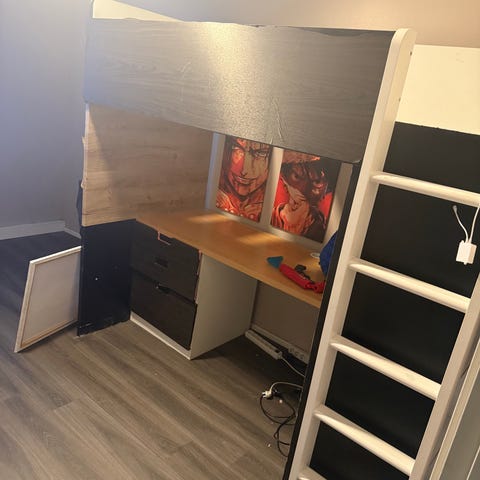 Parvisänky. Tarroja löytyy, natisee myös mutta varmasti parilla lisäruuvilla/seinään kiinnittämällä tulee tukevampi (muistaakseni pari ruuvia puuttuu).