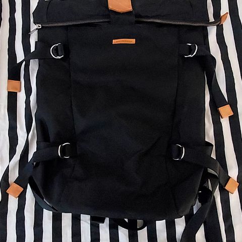 Muistaakseni ollut myynnissä vain ystävämyynneissä. Käytetty, hyvä kunto. Olen poistanut tahrat, mutta ei ole pesty kokonaan. Ainut moite jäljet kahdesta pinssistä repun edessä, mutta nämä eivät erotu, sekä toisessa olkaimen soljessa naarmuja. Nahkaosat hieman patinoituneet uudesta, metalliosat hopeiset. Pinta hieman kiiltävää ja liukasta kangasta, musta väri ei ole haalistunut.