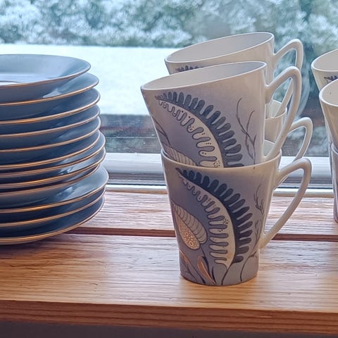 Made in Portugal. Kunto erittäin hyvä, ei käytön jälkiä. Kupin korkeus n. 7,5 cm, halkaisija n. 10 cm, tilavuus 2,5 dl. Aluslautanen halkaisija n. 17 cm. Leipälautanen halkaisija n. 21 cm.