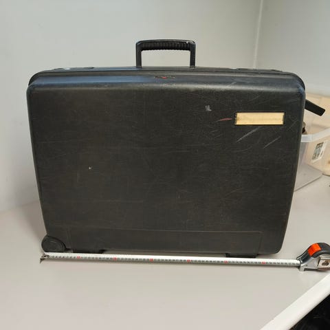Musta Delsey matkalaulku. Käyttö näkyy ulkopuolelta, sisältä puhdas, pyörät pyörivät. 63x41x24cm.