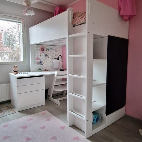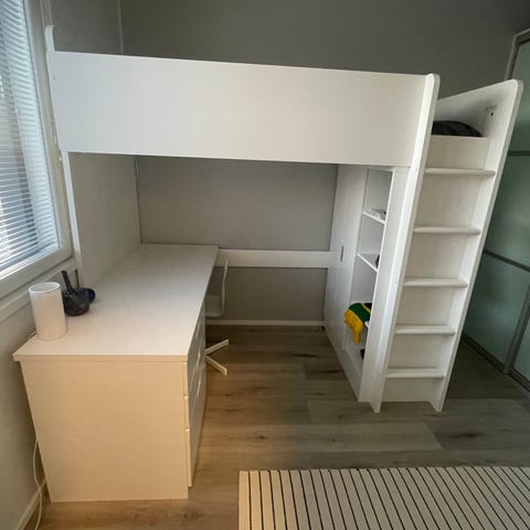 Siistikuntoinen IKEA Småstad -parvisänky. Valkoinen väri, valmistettu kestävästä materiaalista. Sisältää korkealaitaisen vuoteen, työpöydän sekä säilytystilaa. Sopii lastenhuoneeseen.