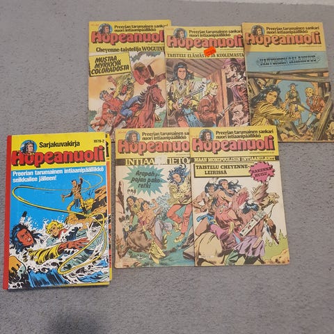 Hopeanuoli sarjakuvalehtiä keräilijälle, klassinko sarjakuva joka kertoo preerian tarumaisesta sankarista, nuoresta intiaanipäälliköstä. Lehdeet ovat täynnä seikkailuja ja jännitystä, kuten 'Kilpajuoksu kuoleman kanssa' ja 'Tonka-intiaanien salaisuus'. Tämä lehti on osa laajempaa kokoelmaa, joka vie lukijan villin lännen maailmaan. Tyydyttävä kunto yleisesti. Osa hyvässä kunnossa, osasta puuttuu kansi. Mukana myös muutamia ylimääräisiä lehtiä. Sisältää:1976: lehdet 1-111977: lehdet 1-27 (numero 21 puuttuu)1978: lehdet 1-25/26 (numero 10 puuttuu)1979: lehdet 1-24 (lehdestä 1 puuttuu kansi)1980: lehdet 1-241981: lehdet 1-24 (numero 2 puuttuu)1982: lehdet 1-241983: lehdet 1-33 (numerot 20, 21, 27 puuttuvat)1984: lehdet 1-52 (muutamia puuttuu)1985: lehdet 1, 4-6, 8, 13, 16, 18BONUS: Taskukirja 1 Pettureiden yö