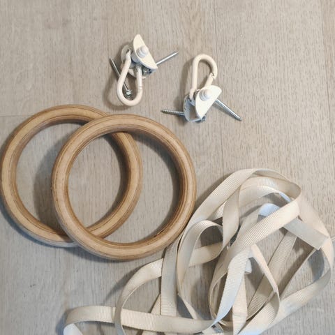Voimistelurenkaat. Liinojen pituutta pystyy kätevästi muokkaamaan. Ei sisällä niitä osia, joilla kiinnitetään kattoon.
