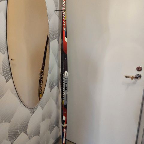 Salomonin skinit. Hiihdetty ensilumilla joten pohjissa pitkittäisnaarmuja, ei hidasta menoa, viime keväänä hiottu suora 7. 70-80 kiloiselle hiihtajälle