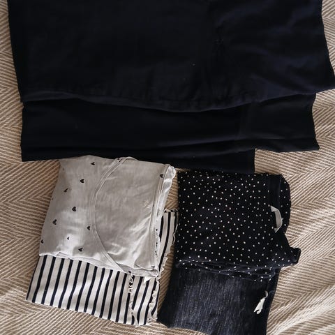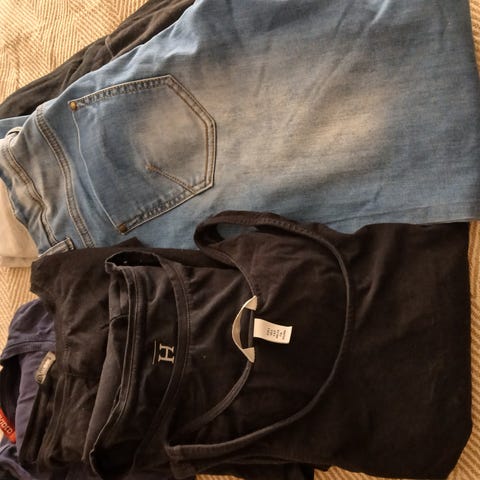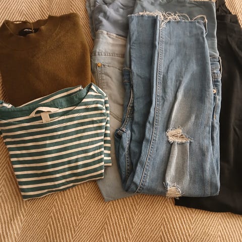 Äitiysvaatepaketti koossa M. Sisältää kolmet housut ja 5 paitaa.