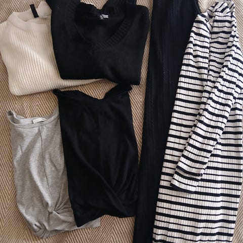 -musta pitkä puolihihainen paita, musta lyhythihainen pitkä urheilupaita ja pitsinen musta hihaton paita (ei äitiysvaatteita, mutta pidetty raskaana ollessa)