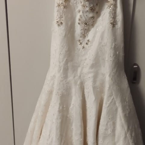 Hävettävän monta vuotta kaapissa roikkunut kaunis Atelier diagonal häämekko strassivyöllä ja pitkällä laahuksella. Puolimerenneito malli. Olkaimeton.