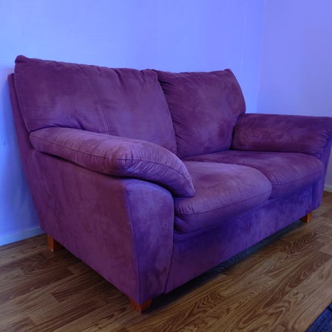 Kahden istuttava sohva, vihreän värinen, tukeva istua.
