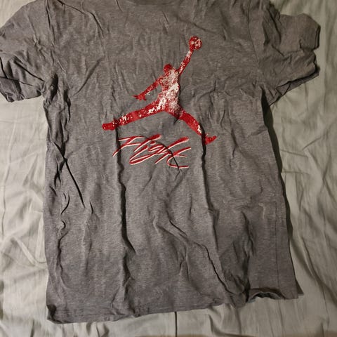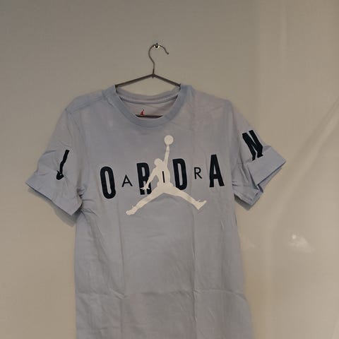 Nike Jordan miesten T-paita, valkoinen, valmistettu puuvillasta. Koko M. Paita sopii arkikäyttöön ja vapaa-ajan pukeutumiseen. Käytön jälkiä vain koko lapussa jokaon hiemna kulunut