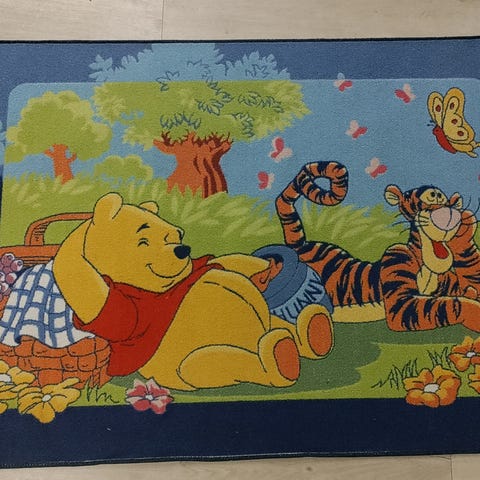 sininen Disney Nalle Puh lasten matto lateksipohjalla. Nukka on valmistettu polyamidista. Maton koko on 100x150cm.