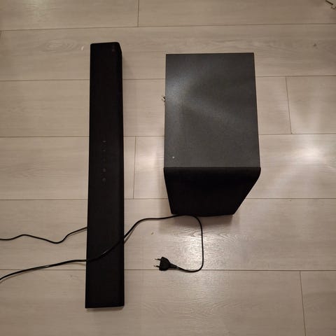 LG kaiutinjärjestelmä koostuu soundbarista ja subwooferista. Järjestelmä on musta ja sisältää johdot ja kaukosäätimen.