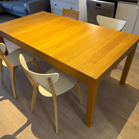 Myydään Ikeasta ostettu täyspuinen ruokapöytä. Malli on stornäs jota ei taida olla myynnissä tällä hetkellä. Leveys 95cm. Pituus lyhyenä 147cm ja jatkopalan (1kpl) kanssa 203,5cm. Jatkopalalle on oma säilytyspaikka pöytälevyn alla.