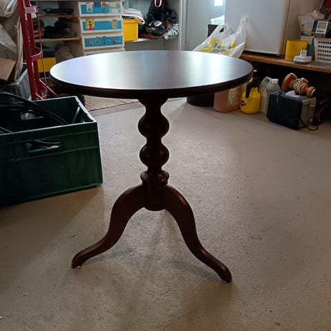 Pinnassa kulumaa. Tukeva pikku pöytä. Pöytälevy 60x60cm ja korkeus 57 cm. Kulkeutuu arkisin Kouvolaan.